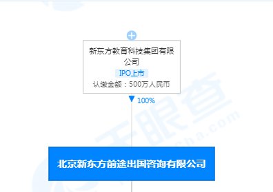 天眼查APP显示,北京新东方前途出国咨询有限公司成立于1996年,由新东方教育科技集团有限公司全资持股,实控人为俞敏洪。同时也是新东方旗下唯一从事出国留学服务的专职机构,公司在北京、上海、深圳、广州、天津、南京等地设有多家子公司。