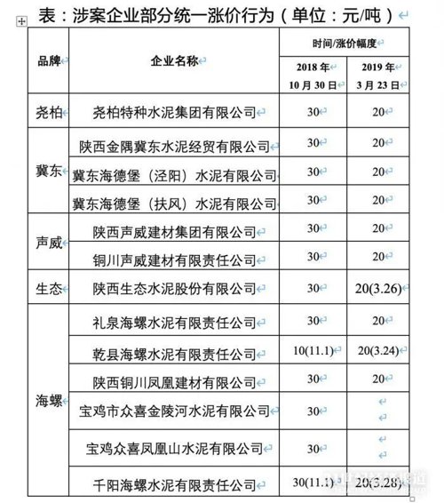 据陕西省市场监督管理局发布的消息,陕西省水泥协会共组织13家当地水泥企业达成并实施垄断协议,13家企业分别为: