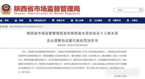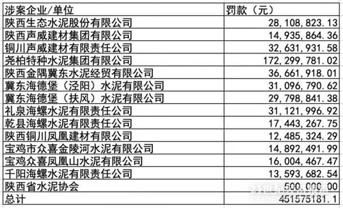 7月9日早间,陕西省市场监督管理局在其官网发布多条行政处罚决定书,对陕西省水泥协会及十三家当地水泥企业联合实施垄断协议的违法行为作出行政处罚,责令当事人停止违法行为,共处罚款约4.51亿元。
