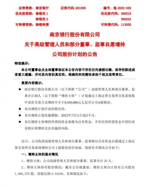南京银行7月11日发布公告称,该行高级管理人员和部分董事、监事合计20人计划通过上海证券交易所交易系统集中竞价交易方式增持不少于845万元公司A股股份。本次增持计划实施期限为2022年7月11日起3个月,不设价格区间。