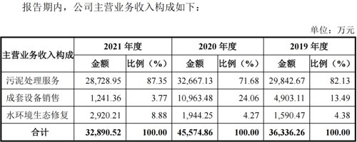 2019~2021年,公司销售的成套设备应用于七格项目和临江项目,分别实现营收4903.11万元、10963.48万元和1241.36万元,收入占比分别为13.49%、24.06%和3.77%;水环境生态修复业务则分别实现营收1590.47万元、1944.25万元和2920.21万元,收入占比分别为4.38%、4.27%和8.88%。