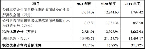 与此同时,我们还发现国泰环保有很大一部分利润源于税收优惠。招股书显示,2019~2021年,税收优惠占企业利润总额的比例分别高达21.32%、15.85%和17.17%。