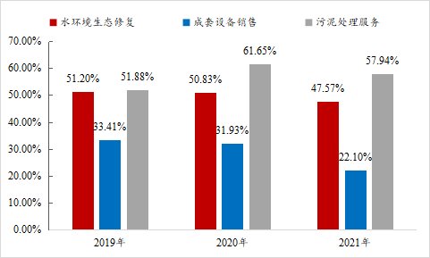 招股书显示,2019~2021年,水环境生态修复的毛利率分别为51.20%、50.83%和47.57%,成套设备销售的毛利率分别为33.41%、31.93%和22.10%。相比之下,国泰环保污泥处理服务的毛利率则分别为51.88%、61.65%和57.94%。