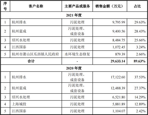 招股书显示,2019~2021年,国泰环保前五大客户所贡献的收入占其总营收的比例分别为94.09%、94.50%和89.63%,客户集中度高达90%左右,与之对应的主要污泥处理项目为七格项目、临江项目、绍兴项目、江西项目和上海竹园项目。