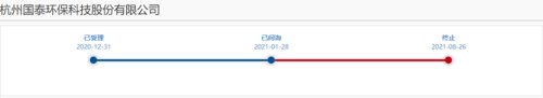 上交所官网显示,国泰环保曾于2020年12月31日向交易所递交了招股书,冲刺科创板。在历时8个月、经历两轮问询后,公司在2021年8月24日和其保荐人国信证券分别向交易所提交了撤材料的申请文件,主动终止了科创板IPO。