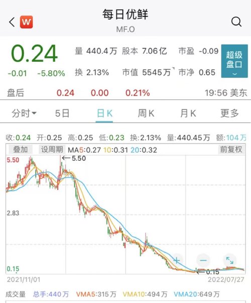 并在2021年6月25日登陆美国纳斯达克,发行价为13美元/股,成为“生鲜电商第一股”。但没想到的是,出道即巅峰,之后每日优鲜的股价跌跌不休,当前股价仅为0.24美元,市值为5545万美元,较高点缩水近96%。