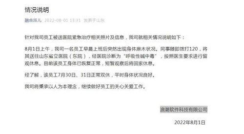 公告称,公司一名员工早晨上班后突然出现身体麻木状况。同事随即拨打120,将其送往山东省立医院(东院),经医院诊断为“呼吸性碱中毒”,按照医生要求进行留观休息。