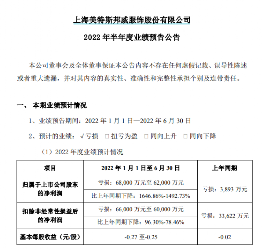 对于上半年亏损原因,美邦服饰表示,首先,受上海新冠疫情封控管制的影响,公司位于上海浦东的物流总部约有2个月时间无法向全国线下门店及线上网购正常发货,致使公司营业收入及经营利润出现下滑。其次,疫情期间部分加盟商绩效不佳,还款出现逾期及应收账款账龄变长,公司计提信用减值损失,对上半年净利润产生较大影响。最后,公司在本报告期内继续对不合理商圈直营店铺进行关闭,导致部分关店成本支出仍较高,一定程度上影响当期营业收入及净利润,但预计对未来业绩产生积极影响。