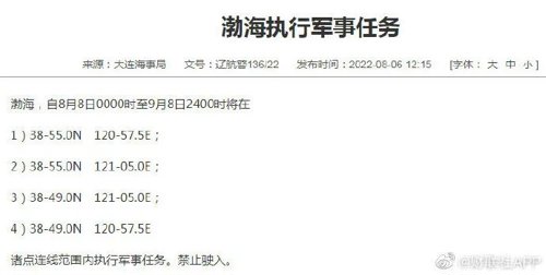 据中国海事局网站消息,大连海事局发布航行警告,自8月8日0时至9月8日24时,渤海部分海域执行军事任务,禁止驶入。