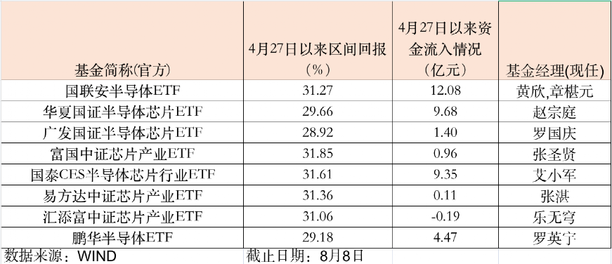 经历过了前期的大跌之后,半导体板块从今年4月开始高调反弹,多只半导体芯片相关ETF也是边涨边“吸金”。Wind数据显示,截至8月8日,国联安半导体ETF从4月低以来收益率达31.27%,期间“吸金”超12亿元。华夏国证半导体芯片ETF、国泰CES半导体芯片行业ETF的区间回报分别为29.66%、31.61%,期间“吸金”均超9亿元。整体来看,场内8只半导体相关ETF合计“吸金”近40亿元。