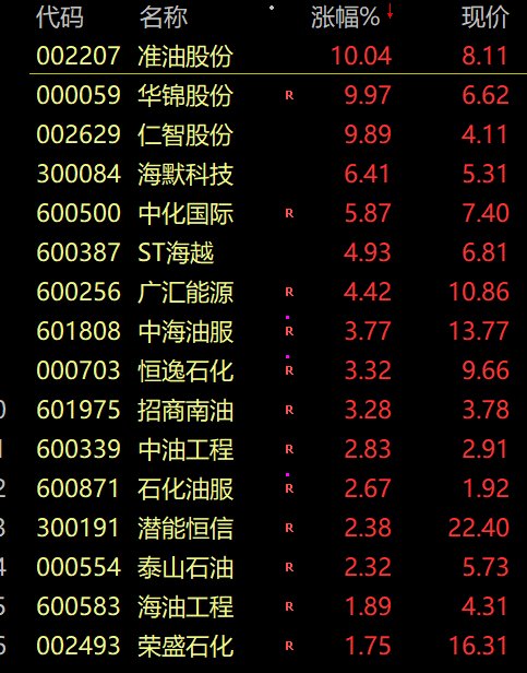 能源板块全天强势,油气开采板块领涨,煤炭、燃气板块涨幅靠前,准油股份、贝肯能源、仁智股份涨停,山煤国际、神火股份涨超5%。据报道称,不久中方跟沙特有大动作。