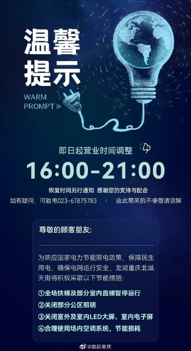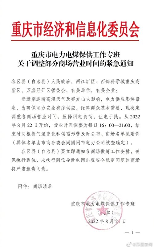 为确保电力供应,8月22日从重庆市经信委了解到,重庆市电力电煤保供工作专班日前发布关于调整部分商场营业时间的紧急通知。