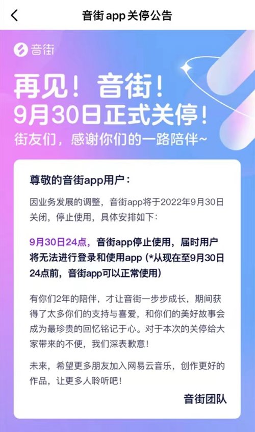 近日,网易云音乐旗下K歌App“音街”发布公告称,因业务发展的调整,平台将于9月30日停止使用,届时用户将无法进行登录和使用App。