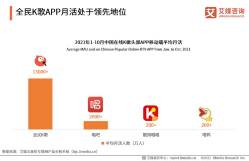 在此背景下,在线K歌APP也分化明显。数据显示,2021年1-10月,中国在线K歌APP中全民K歌的平均月活在1.3亿左右,处于行业领先地位。其次是老牌K歌软件唱吧,约为2000万,整个榜单中未现音街。有分析指出,全民K歌之所以可以后发制人是基于腾讯系App强大的社交能力和腾讯音乐的版权支撑。