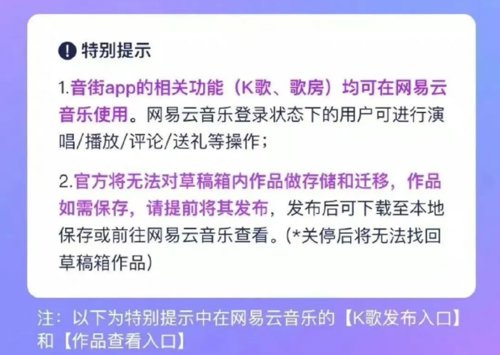 目前,音街App的相关功能(K歌、歌房)均可在网易云音乐使用。网易云音乐登录状态下的用户可进行演唱/播放/评论/送礼等操作;官方将无法对草稿箱内作品做存储和迁移,作品如需保存,请提前将其发布,发布后可下载至本地保存或前往网易云音乐查看。