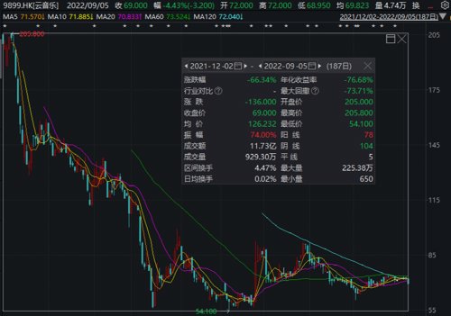 网易云音乐频获丁磊增持,据港交所最新权益披露资料显示,8月31日,丁磊增持0.69万股云音乐股份,涉资49.42万港元。增持后,丁磊最新持股数目为1.29亿股,持股比例升至61.33%。但云音乐的股价却表现不佳,上市以来该股已经跌超66%。截至目前,该股报69港元/股,总市值为145亿港元。