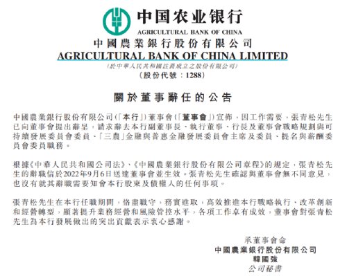 9月6日,农业银行也发布公告称,因工作需要,张青松先生已向董事会提出辞呈,请求辞去该行副董事长、执行董事、行长及董事会战略规划与可持续发展委员会委员、“三农”金融与普惠金融发展委员会主席及委员、提名与薪酬委员会委员职务。张青松先生的辞职信于2022年9月6日送达董事会并生效。