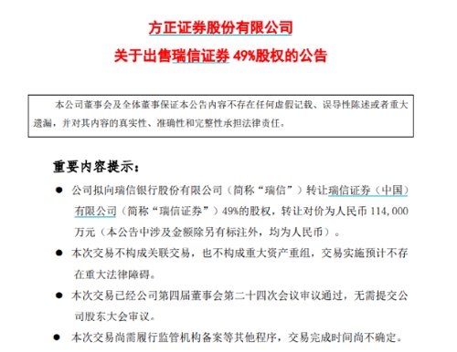 9月8日晚间,方正证券公告称,拟向瑞信银行股份有限公司转让瑞信证券(中国)有限公司49%的股权,转让对价为11.4亿元。