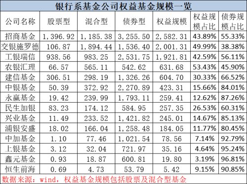wind数据也显示,从产品结构上看,银行系基金公司仍以固收类产品为主,权益基金规模能超过千亿的的银行系基金公司目前只有招商、交银施罗德、工银瑞信三家,权益基金规模占非货基金比重能超过30%的银行系基金公司也只有农银汇理、交银施罗德、招商、工银瑞信、建信等5家公司。