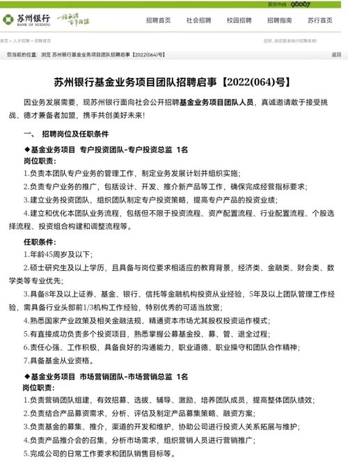 除了公募基金牌照,今年3月,苏州银行获批证券投资基金托管资格,成为近8年来首家获批基金托管资格的中资银行,最近几个月,苏州银行还对外发布基金业务项目团队招聘启事,招揽专户投资总监、市场营销总监、产品创新总监、运营总监等多类人才,开拓基金相关业务的意图非常明显。