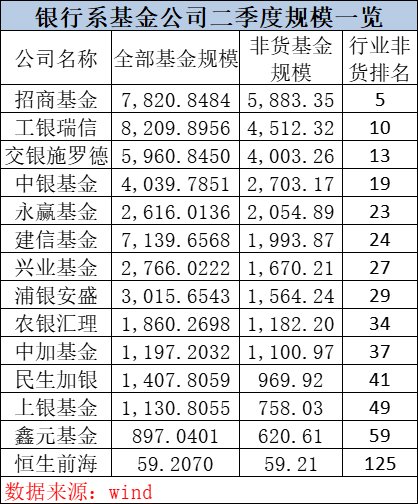 早在2005年6月,工银瑞信基金成立,成为国内第一家由银行直接发起设立并控股的基金公司,拉开“银行系”基金公司筹建的序幕,截止今年二季度末,由商业银行担任大股东的基金公司共有14家,合计管理的非货币基金规模接近3万亿元,其中,招商基金、工银瑞信基金跻身行业前十,除此之外,还有10家“银行系”基金公司非货规模位列行业前五十名。