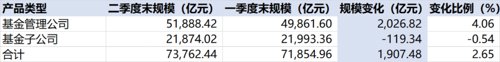 具体来看,基金公司的资产规模单季度增加了2026.82亿元,达到5.19万亿元;基金子公司的资产规模则单季度减少119.34亿元,为2.19万亿元。
