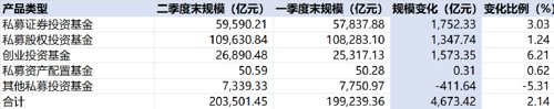 从二季度的情况来看,私募证券投资基金规模增加最多,二季度较一季度末增加1752.33亿元,达到了5.96万亿元;另外,创业投资基金、私募股权投资基金分别增加1573.35亿元、1347.74亿元至2.69万亿、10.96万亿,私募资产配置基金与上季度几乎持平,其他私募投资基金规模则出现一定下滑。
