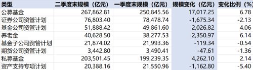 其中,公募基金规模最大,二季度末为26.79万亿元,较一季度末增加6.78%;其次,私募基金规模达到20.35万亿元,较一季度末增加2.14%;证券公司及其子公司私募资产管理业务规模7.68万亿元,较一季度末减少2.13%,基金管理公司及其子公司私募资产管理业务规模7.38万亿元,较一季度末增加2.64%。