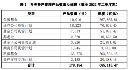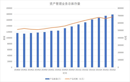 数据显示,截至2022年二季度末,基金管理公司及其子公司、证券公司、期货公司、私募基金管理机构资产管理业务总规模约68.51万亿元,较一季度末增加约2.27万亿元,再创历史新高。