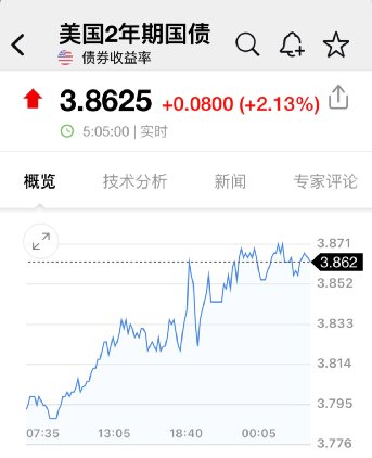 对利率前景更加敏感的美国2年期国债收益率日内一度攀升9个基点至接近3.88%,2007年来首次盘中上破3.87%,美股收盘时约3.86%。10年期国债收益率上涨2个基点,升至3.449%,国债收益率倒挂幅度进一步扩大。此外,5年期与30年期国债收益率曲线倒挂19个基点,创本世纪初2000年以来最高水平。