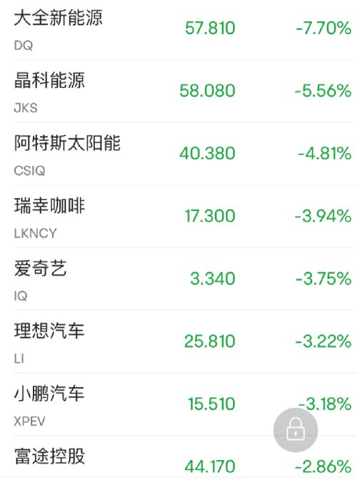 其他个股中,大全新能源跌7.74%,晶科能源跌5.56%,瑞幸咖啡跌3.94%,爱奇艺跌3.75%;涨幅方面,寺库涨34.62%,盈喜集团涨12.97%,能链智电涨10.1%,36氪涨5.5%。中概新能源汽车股全线走低,蔚来汽车跌1.91%,小鹏汽车跌3.25%,理想汽车跌3.22%。