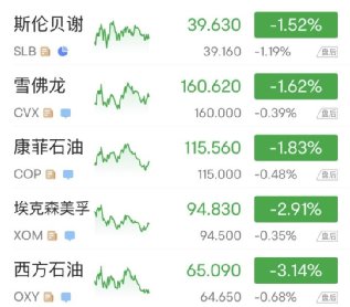 能源股全线走低,埃克森美孚跌2.94%,雪佛龙跌1.61%,康菲石油跌1.87%,斯伦贝谢跌1.5%,西方石油跌3.15%。