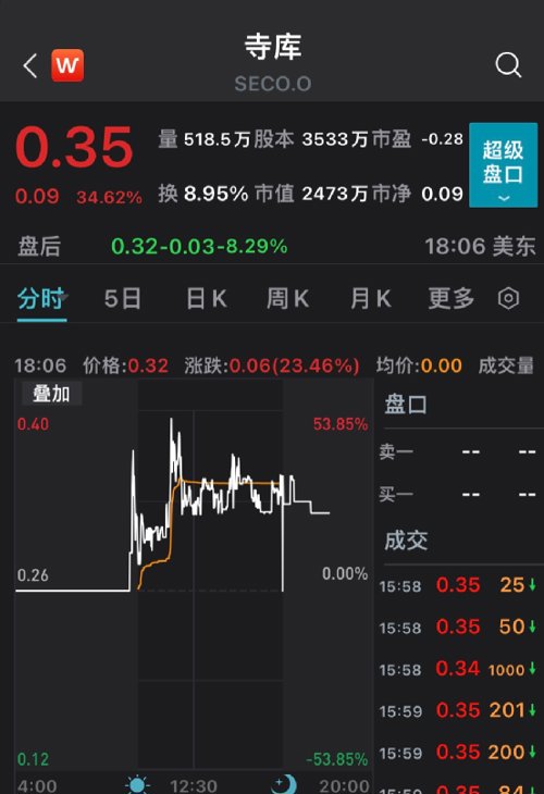 在中概股多数下跌的情况下,寺库集团(SECO.O)宣布一则重磅合作使得该股周四盘中大涨50%,收盘涨34.62%,报0.35美元。