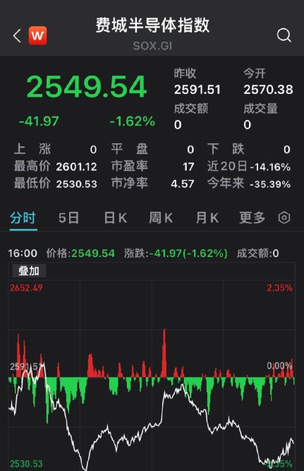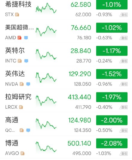 芯片股总体回落,费城半导体指数和半导体行业ETF SOXX分别收跌1.6%和1.7%,跌回两月低谷。标普500的IT板块成份股中,博通跌超2%,高通跌2%,应用材料和拉姆研究跌近2%,英伟达和英特尔跌超1%,AMD和希捷科技跌约1%。