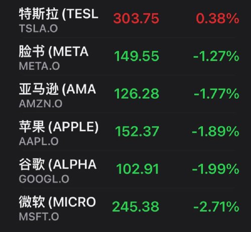 科技股多数下跌,万得美国TAMAMA科技指数跌1.77%,谷歌跌1.99%,苹果跌1.89%,亚马逊跌1.77%,脸书跌1.27%,微软跌2.71%,特斯拉涨0.38%。