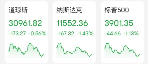 截至美东时间周四收盘,美国三大股指均创近两个月新低。道指跌173.27点,跌幅为0.56%,报30961.82点;纳指跌167.32点,跌幅为1.43%,报11552.36点;标普500指数跌44.66点,跌幅为1.13%,报3901.35点。