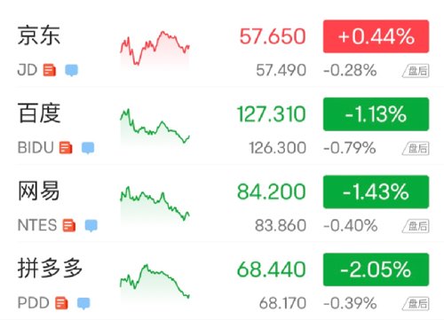 热门中概股多数追随大盘回落,纳斯达克100指数的四只成份股中,拼多多跌超2%,百度和网易跌超1%,京东涨0.44%。