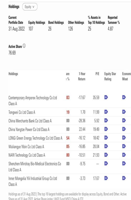 前十大重仓股重仓股组合占比为25%,组合较为分散。组合含107只股票和26只债券。截至8月底,重仓股包括宁德时代、通威股份、招商银行、长江电力、隆基绿能、五粮液、国电南瑞、迈瑞医疗、伊利股份等。 前五大重仓股中有两只股票过去一年股价上涨,其余三只过去一年股价下跌。