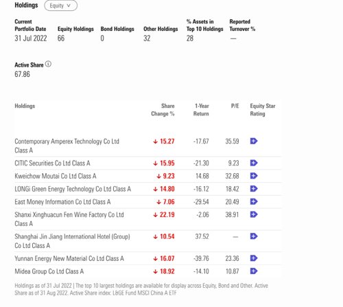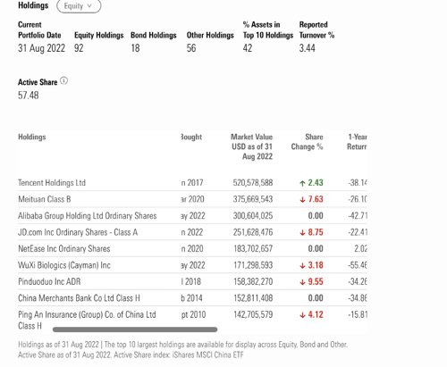 目前海外第三大中国股票基金-“摩根基金-中国基金A”最新规模53.6亿美元。截至8月底,2022年基金净值下跌13.1%。截至8月底,摩根基金-中国基金A 的重仓股包括腾讯控股、美团、阿里巴巴(港股)、京东(港股)、网易(港股)、药明生物、拼多多、招商银行、中国平安。基金前十大重仓股占基金资产42%。