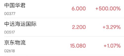 而中国华君所在的港股供应链管理行业板块今日上涨,其中,中国华君涨500%,中远海运国际涨3.29%,京东物流涨超1%。