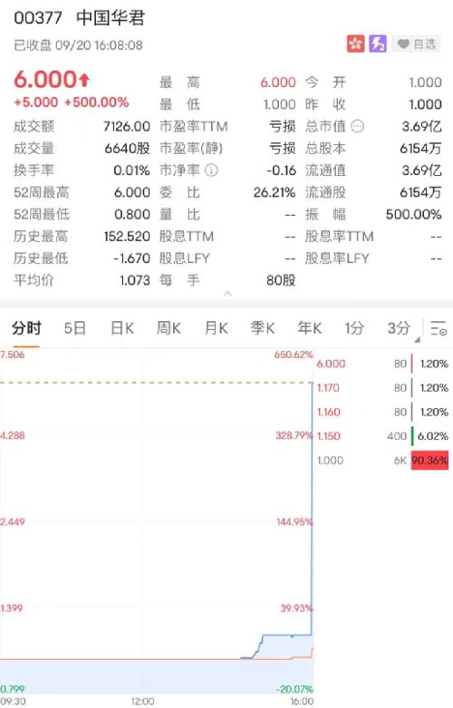 9月20日,港股收盘前最后几分钟,贸易及物流业务公司中国华君股价突然异动,极速上涨,截至收盘,收涨500%,最新总市值3.69亿港元。