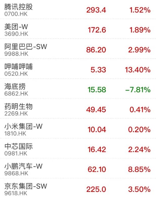 盘面上,科技、新能源汽车、博彩股涨幅居前,金沙中国涨近8%领涨蓝筹;小鹏汽车涨近9%,理想汽车涨近6%,蔚来涨近5%。回港科技股多数上涨,携程集团涨超5%,网易涨近4%,京东涨3.5%,阿里巴巴涨3%。餐饮股分化,呷哺呷哺涨超13%,海底捞跌近8%。零售股中国美零售遭大股东黄光裕和杜鹃减持,收跌5.71%。