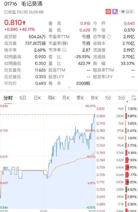 毛记葵涌今日高开,全天保持涨势,尾盘更是大幅拉升约32%,成交量创一年来新高。截至收盘,毛记葵涌收涨42.11%,报0.81港元/股,最新市值2.19亿港元。