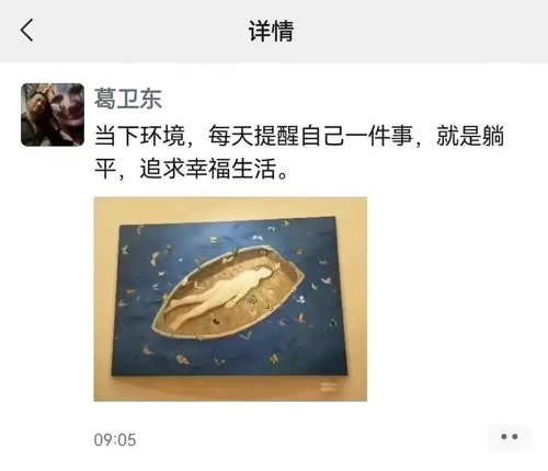 据传私募大佬葛卫东在朋友圈里发了一段话:“当下环境,每天提醒自己一件事,就是躺平,追求幸福生活”。