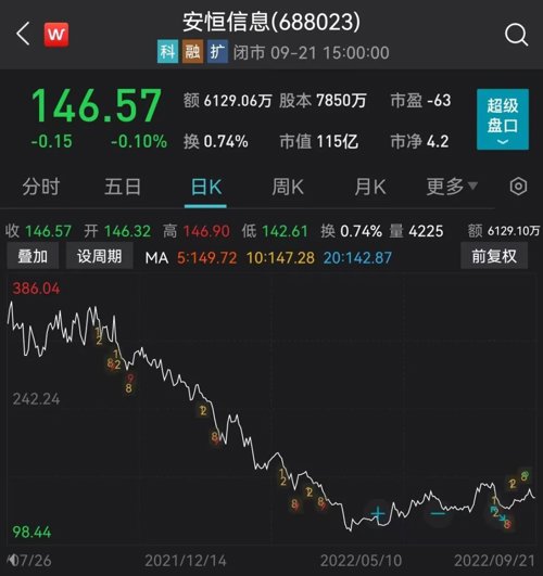 不过,在众机构拿出真金白银参与定增之后,安恒信息2021年三季度业绩不达预期,归属于上市公司股东的净利润出现3364.18万元的亏损,今年上半年受疫情影响,公司营收增速放缓,二级市场股价一路直线下坠,从去年10月起,月线出现8连跌,到今年4月21日解禁当日,股价已经跌至139.72元,相比此前的定增价格跌超55%。