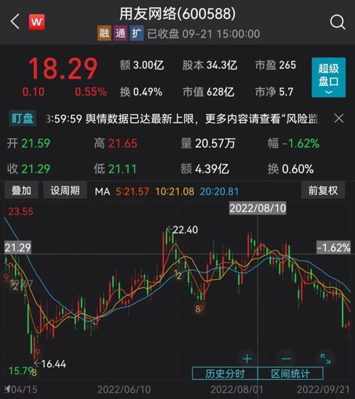 8月,用友网络的股价好容易在20元附近震荡,结果步入9元,股价再次破位下行。截至21日收盘,用友网络报收18.29元,较定增价仍然下跌43%。