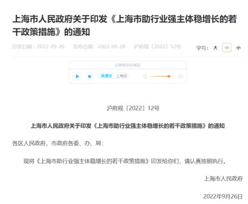 9月28日,上海市人民政府印发《上海市助行业强主体稳增长的若干政策措施》,提出加大航空业纾困补助力度。制定实施2022年上海航空业补助方案,重点对消杀、核酸检测、空中保障能力建设、货邮国际中转业务等方面给予补贴,支持航空业防疫和恢复发展。加大文化旅游体育行业纾困力度。