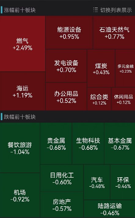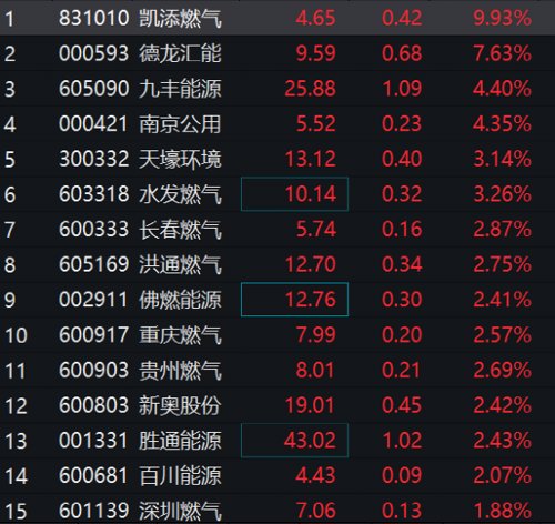 值得关注的是,天然气板块表现相对优秀,北交所凯添燃气一度涨超13%,德龙汇能、九丰能源集体大涨。
