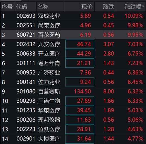 个股方面,双成药业、尚荣医疗、百花医药开盘不久即拉出涨停板,九安医疗、粤万年青、广济药业、开立医疗等多只个股涨超5%。从细分赛道来看,带动此轮涨势的仍是中药板块。