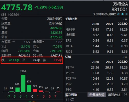 截至发稿,沪深两市飘绿个股已超4100只,仅715只飘红。